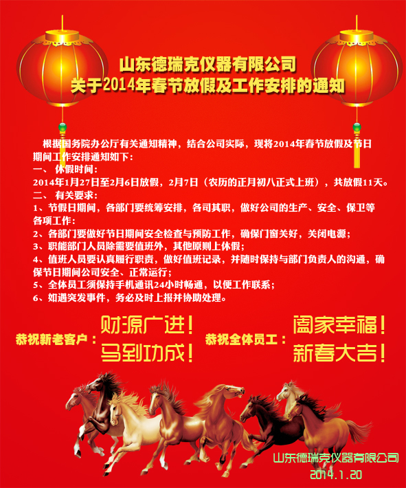 山東德瑞克2014年春節放假通知