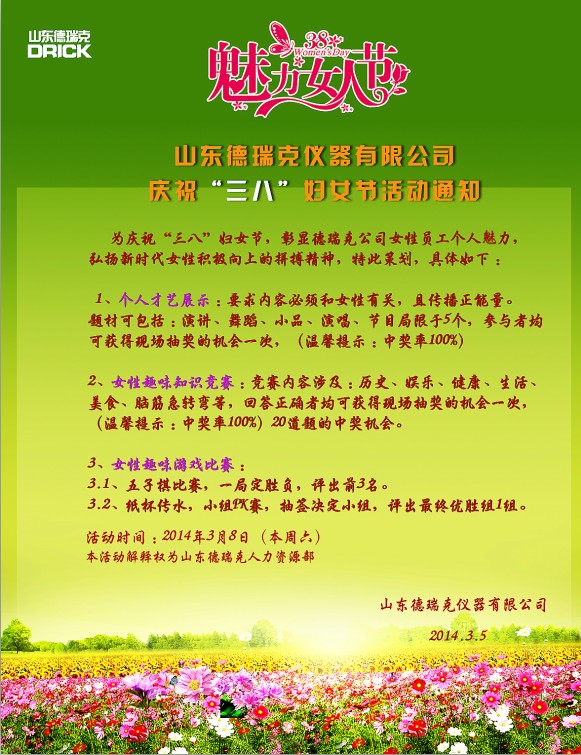 我國于194912月規定每年的38日婦女節,迄今為止已有60多年的歷史,而今年恰逢是三八婦女節第65周年。為了活躍企業(yè)文化氛圍,表彰和感謝女同胞們?yōu)楣咀龀龅呢暙I,山東德瑞克儀器有限公司決定于38日為所有女員工準備了一系列別開(kāi)生面的歡慶活動(dòng),在表彰和感恩的同時(shí)也為德瑞克女同胞們展示個(gè)人才藝,彰顯女性風(fēng)采提供了一個(gè)良好的舞臺?;顒?dòng)具體內容如下: