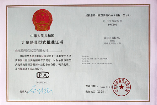 近日,德瑞克接到市局通知,在濟南市質(zhì)量技術(shù)監督局一樓計量器具型式許可證窗口領(lǐng)取到了電子拉力試驗機型式批準證書(shū)(證書(shū)編號2014F376-37),加上之前領(lǐng)取的電子式抗壓試驗機(證書(shū)編號2014F277-37)、電子式壓縮試驗儀(證書(shū)編號2014F278-37)的型式批準證書(shū),至此,德瑞克涉及的國家法定監管的計量產(chǎn)品已全部獲得證書(shū)。
